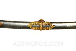 This saber came out of that collection and has the museum inventory number painter on the scabbard. The saber was made by Sauerbier and is an early Civil War production with a plan hilt with ornate chase-work depicting a canon and a floral design. It retains much of the original gold finish and 100% original leather grip and triple wire. The blade washer is unique to Sauerbier and it holds the etch blade tight. It retains much original frosting, has amazing etching, and is retainer marked S.C. Bunting Jr. Philadelphia. Bunting acquired swords from a variety of makers, and finding a marked example is extremely rare. The scabbard is original to the saber with all brass fitting unique to Sauerbier. This is a rare saber that came out of one of the best know Civil War collection. Shipping and Insurance included in this price. $4500.00