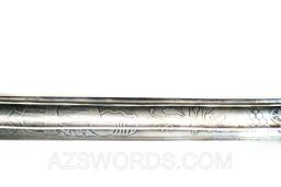 A224. EMERSON & SILVER - PRESENTATION GRADE DAMASCUS STEEL SILVER HILT STAFF & FIELD SWORD: This is a presentation grade silver hilt staff & field sword with a Damascus steel blade. The hilt and scabbard design are associated with Emerson & Silver, Trenton, New Jersey. The hilt is the large basket style guard with a center medallion with and America Eagle clutching a shield, and a stand of 8 flags with a top ribbon with 13 stars, and a German Silver grip with twisted brass wire. The original leather blade washer holds the 32 1/2-inch Damascus steel blade tight. It is Gold & Blue etched IRON PROOF on the spine, with US and the American Eagle on the blade. The steel scabbard has a nice gray patina and retains all its fancy mounts, but is missing the screw for the throat piece. It is rare to find a Civil War sword with a Damascus steel blade. Shipping & Insurance included. $5500.00