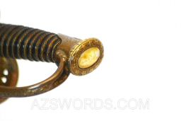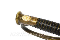 A294. HIGH-GRADE ENGLISH PATTERN NON-REGULATION STAFF & FIELD OFFICERS SWORD: This is a rare example of an English Pattern Non-Regulation Staff & Field Officers Sword with a shark-skin covered wood scabbard. The large gold wash basket hilt is tight with 100% original gold, shark-skin grip, and twisted wire. The original red leather blade washer holds the gold washed blade tight. There is a starburst with a brass PROOF dish at the base; gold etched script US and an American eagle. The scabbard is complete with all mounts, but is missing all but one screw. Still all mounts are tight. This is an extremely rare pattern sword and is missing from most advance collections. The photos do not do the sword justice. Shipping & Insurance included. $5900.00