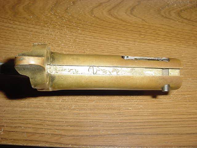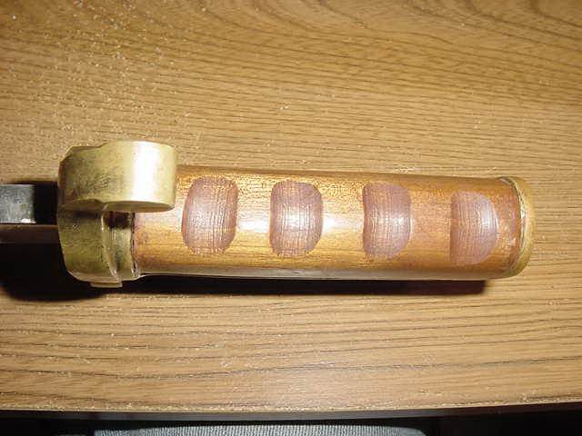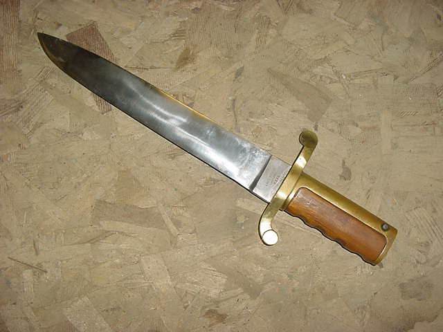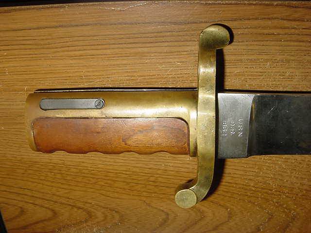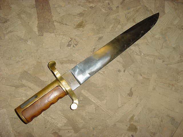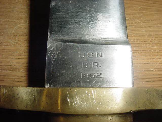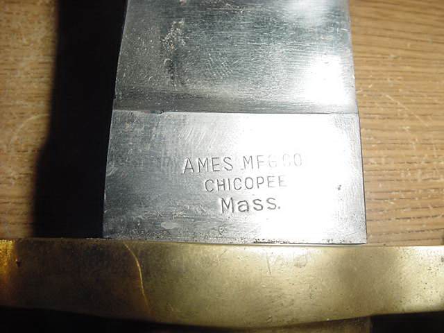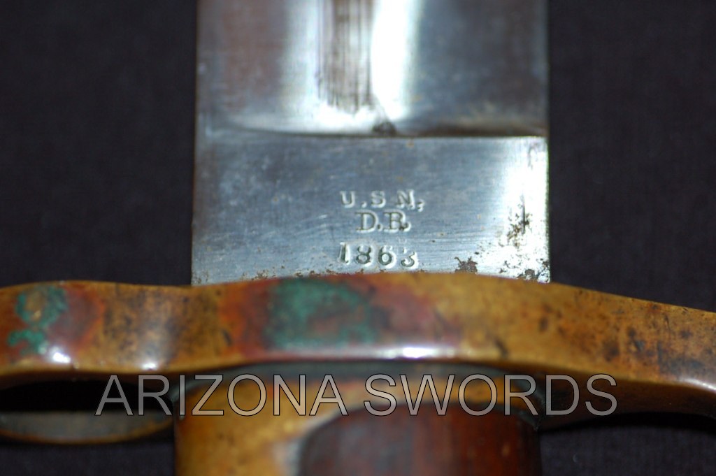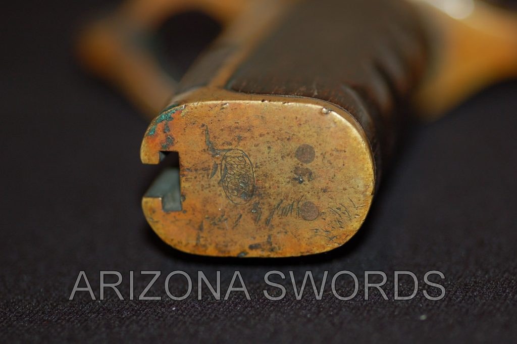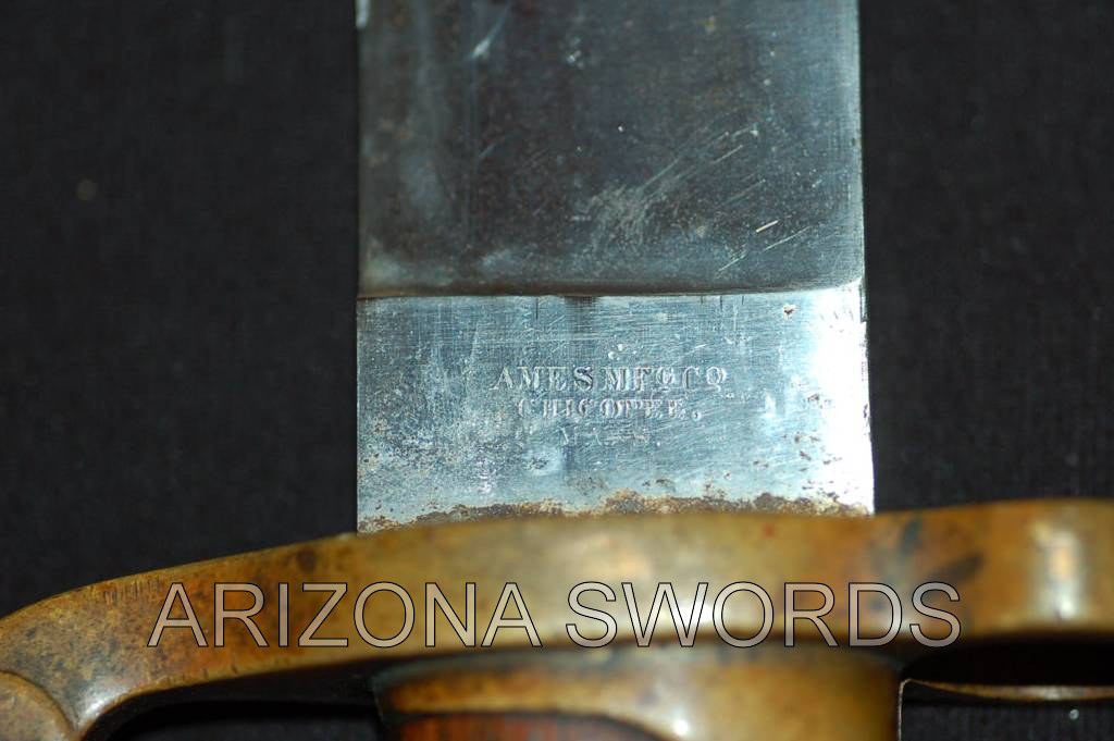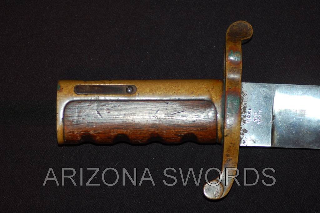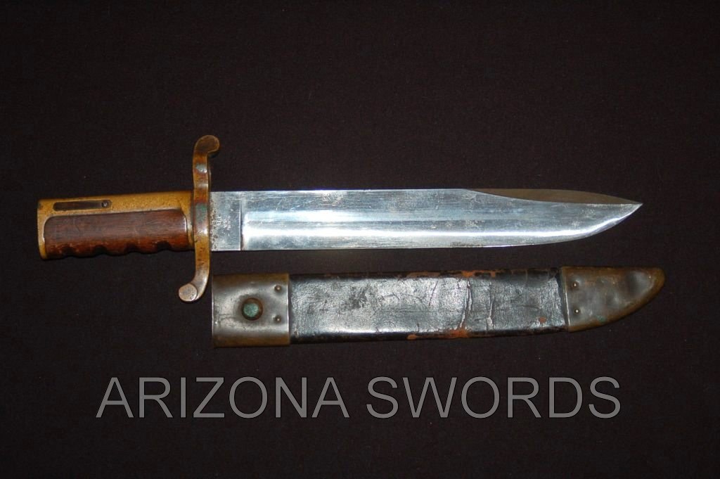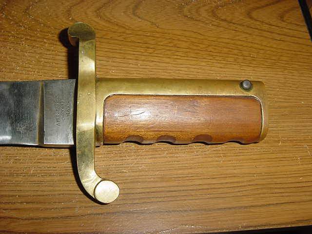 ARIZONA SWORDS Click on any thumbnail for a larger image. This is a fake/reproduction DAHLGRENBOWIE BAYONET. These are well made so you have to look closely to not be fooled. The key is the markings on the blade, not the pommel. The fake Ames and inspection marks do not conform to the style use during the Civil War. Also,the spring retain screw on the fake is flate where the real one is rounded. Compair the photos with the real one posted below. FAKE/REPRODUCTION REAL |